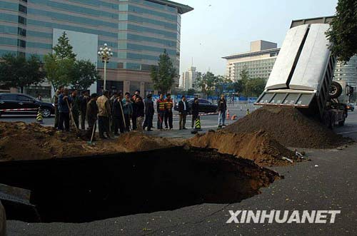 從早上7點半開始,北京市政部門向坑內填注大量水泥并在上面覆蓋了4塊鋼板,經過4個小時的搶修,塌陷路段內側車道已經恢復通行。