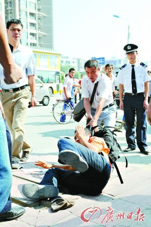 廣州日報10月18日報道 昨天上午10時,廣州市中山大道,四個壯漢當街毆打一名《廣州青年報》的送報員,兩名白色衣服的保安自始至終在一邊旁觀。后來,有市民上前勸說阻擋,并協(xié)助警察將其中兩名犯罪嫌疑人抓獲。