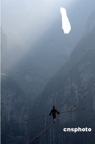 十八日下午一時許,沒有任何保護措施的賽買提手持平衡桿開始向天門山極限坡度發起挑戰。由于開始階段體能充沛,賽買提在直徑為三點一厘米的鋼索上健步前行,不到十分鐘就走了一百多米。此后的一段時間里,賽買提走得十分小心,不斷地利用平衡桿穩定身體。