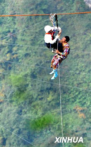 中新社張家界十月十八日電 (鄧霞 張家根 李景華)“高空王子”阿迪力的親侄子賽買提·艾江,十八日在張家界天門山的萬仞絕壁之間展示了“達瓦孜”驚人絕技。雖然賽買提在距離終點五十米處“失手”,被救援人員安全接回終點,但在傾斜度達三十九度的鋼繩上行走了六百五十米,賽買提已成功挑戰了世界最大斜度的高空走鋼絲極限。