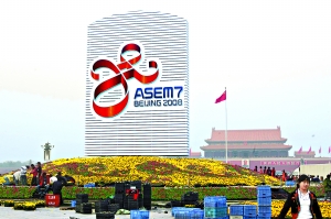昨天,天安門廣場中心花壇基本完成“變身”,第七屆亞歐首腦會議標識在廣場上亮相。李剛攝