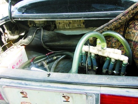 “為了避人耳目,大鐵箱被用布蓋著。鐵箱上連著直徑有5厘米粗、內(nèi)有鐵絲的硬質(zhì)塑料管,五六米長(zhǎng)的管子上安裝有閥門(mén)、連接有油泵、進(jìn)出油過(guò)濾油器、開(kāi)關(guān)等。原來(lái)轎車(chē)就是用這根‘長(zhǎng)鼻子’把大貨車(chē)的油偷走了。”李靖明說(shuō)。