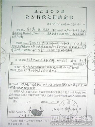 “紀(jì)委的處理不針對短信內(nèi)容,只針對公安局的行政處罰決定書作出的處理。”11月4日下午,通江縣紀(jì)委常委、負(fù)責(zé)辦案的向靜平在接受采訪時表示:“自己至今都沒有看到這個‘七律詩’。”