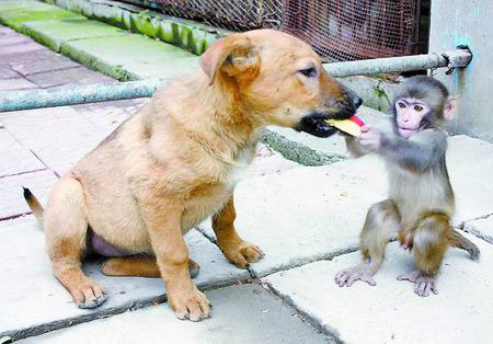 昨天(5日)上午,記者在駐馬店市南海公園動物園看到,一只6個月大的雌性小狗與年齡比自己小一個月的雄性猴崽愉快地在一起玩耍。