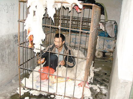 該村村民告訴記者,今年37歲的薛建倉在17歲時遭遇搶劫受到強烈刺激,患上精神分裂癥,十多年前其父因病去世,母親半身不遂臥病在床,薛建倉現由他的大姐照顧。2006年6月,薛建倉病發時將叔叔砍死,今年8月份,他又發病,一把火將自家房屋燒毀。由于發病時的薛建倉極具攻擊性,曾多次襲擊附近村民,并揚言要殺人,為了全村人的安全,村民與薛建倉的姐夫董選斌商量,在沒有想出好辦法之前,將薛建倉用鐵籠囚禁了起來。這個鋼筋焊成的鐵籠長2米,寬1米,高約1.4米,一堆破碎的棉絮散落在籠內,薛建倉吃住就在其中。