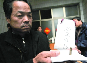 11月7日,在西安市碑林區(qū)電子城街道辦事處丁家村,村主任候選人趙金表收到一“紅包”,里面裝有一顆手槍子彈。趙金表認為是恐嚇,向派出所報案。據(jù)悉,趙金表在該村當了6年村主任。8日,該村又一次選舉新村主任,趙金表又作為候選人之一參選。袁景智 攝
