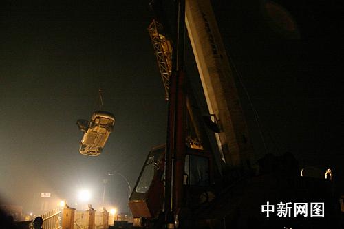 一輛車被吊起。攝影:江耘