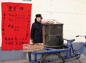 從“水冰月”所發(fā)的照片可以看到,賣(mài)紅薯者是一名年約30歲的男子,身穿深色皮襖,頭戴一頂雷峰帽,在一輛三輪車(chē)上放著一個(gè)由汽油桶改裝的烤爐。在烤爐上面,擺放著多個(gè)烤好的紅薯。另外,在其中的3個(gè)紅薯上面還分別插了牌子,分別寫(xiě)著“和珅”、“秦檜”和“謝X龍”。
