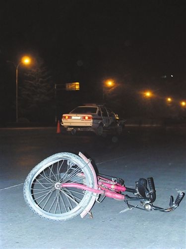 23時(shí)45分左右記者趕到事發(fā)現(xiàn)場(chǎng)時(shí),幾名交警正在勘查現(xiàn)場(chǎng)。昏黃的路燈下,公路中間躺著遇難者;幾米遠(yuǎn)處,是那輛輪胎已經(jīng)變形的自行車;距自行車10米遠(yuǎn)的地方,停著一輛右側(cè)前燈處有嚴(yán)重“撞傷”痕跡的警用普通桑塔納轎車,警車車牌為“川Z0189警”。