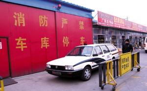 停靠在朝陽東郊市場內消防車庫門前的“山寨警車”。晨報記者 蔡代征/攝