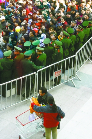 “新店開張,油、米、面、肉低價促銷,還發券,能不吸引人嗎?”李先生說,昨日上午9時許,他原準備趕在超市剛開門就進去轉轉。但一到萬達廣場,只見家樂福門口聚集著大量顧客,數百人的隊伍早就排至數十米外,并還在不斷膨脹。為維持秩序,工作人員在隊伍兩側安置了簡易護欄,同時,數十名武警一字站開,引導眾人進入超市。