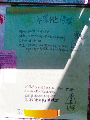 “太強(qiáng)悍了,圣誕節(jié)愛情宣言竟然貼到了我們女生宿舍的宣傳欄上!”江南大學(xué)一名女大學(xué)生向記者報料稱,該校北區(qū)女生宿舍樓下的宣傳欄里出現(xiàn)了一張張名為“水果攤情緣”的“很強(qiáng)大”的求愛海報。