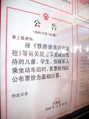 昨天下午,記者來到北京站售票大廳,在大廳的公告欄上看到,一張編號為“2008年第189期”的公告上稱,奉上級通知,按《鐵路旅客運輸規程》等有關規定享受減價優待的兒童、學生、傷殘軍人乘坐動車組時,其票價均以公布票價為基礎計算。