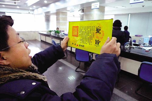 “奉天承運(yùn),皇帝詔曰……張磊要對她比自己還要好……”昨天上午,在杭州體育場路某銀行,這一電視劇里的場景成了現(xiàn)實(shí):小伙子張磊大約清宮戲看多了,手持“圣旨”,滿腔熱情地宣讀了自己對女孩小如(化名)的愛意。