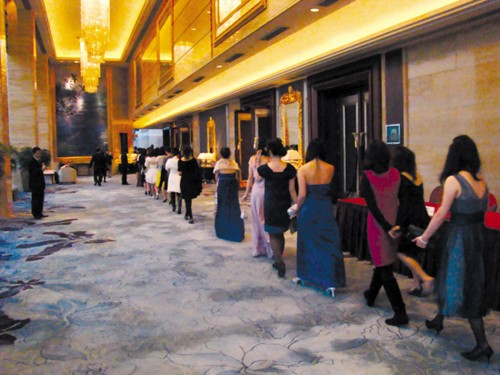 也許佳麗們太緊張了,車到酒店門口時,一大群西裝革履、胸佩飾花的男子迎在門口,嚇得有些人不敢下車。后來才弄清楚,這群人原來是來開婚宴的。隨后,盛裝靚女們被送到一休息室進(jìn)行最后換裝。
