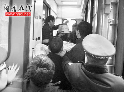 昨日下午4時40分,株洲火車站原定停靠二站臺的廣州開往成都的K193次列車緩緩駛進一站臺。站臺上,從一輛早已等候在此的救護車上,醫生、民警和患者家屬合力抬下一副擔架登上列車。擔架上躺著一名戴著呼吸機、處于重度昏迷的患者。