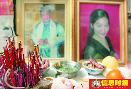 走進(jìn)屋里,首先映入眼簾的是阿瑩和峰哥兩個(gè)人的大鏡框遺照,擺放在房門左側(cè)一張桌子上,前面燒滿了香!斑@個(gè)靈堂是阿瑩親手布置的,原本是作為峰哥的靈堂,阿瑩死之前偷偷做了一張同樣大小的遺照,然后把遺照放在上面,讓它變成了兩個(gè)人共同的靈堂。”