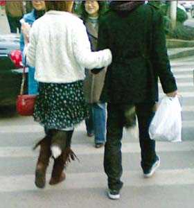 一對年輕的情侶手挽手走在大街上,兩人衣服背后竟各有一條狐貍尾巴。1月19日,有網友在網上發帖稱,自己在楊家坪直港大道遇到了身著“狐尾裝”的一對男女,并附有手機拍攝的照片。該帖發出后,引來網友熱議,許多80后的網友直呼“妖孽”,并大嘆跟不上這種怪異潮流。