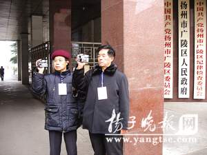 第6組成員8:10來到邗江區政府門前,看到市民觀察團來“檢查”節后上班情況,保安很配合地告知各種情況,并主動指點大家到辦公區域查看。8:30,團員們又來到大門口,還陸續有人急急忙忙地趕過來,初步統計,遲到的有20多人。8:50,觀察團成員來到區政府對面的區地稅局、區財政局大樓前,跟保安說明情況后進入院內,這時一中年人趕過來上班,團員們詢問:“請問你們幾點上班?”不想對方氣惱地回答:“你問這個干什么?我是來辦事的!”大家剛剛進入辦公區域,這時保安跑過來請他們出去,并說:“請你們理解,別把我的飯碗砸了!”