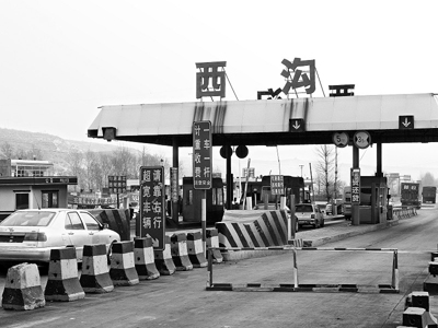 西溝收費站共設置四個收費口,2月7日中午只有兩個收費口開通,其余兩個收費口關閉,并在收費口放置了鐵架子。經詢問,一名收費員說:“封閉收費口的電腦壞了,剛才正在修電腦!币娪腥擞檬謾C拍攝被堵車輛時,西溝收費站突然沖出了幾名工作人員,讓榆林至神木方向的另外一個通道開始放行。