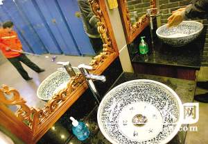 廁所里面布局大體和普通廁所一致,不同的是,洗手池是高檔的青花瓷,而且還多出了專供殘疾人士和母嬰專用的兩個隔間。隔間的門是紅色木雕門(男廁為藍色),且是明清風格的兩扇拉門,其上雕刻細致,圖案精美,連拉環的做工都很逼真,記者感覺,進去如廁就好像進了一個古時候的廂房。
