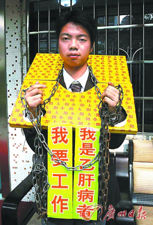 原來(lái),這位自戴“枷鎖”者叫羅思文,今年將從江西機(jī)電學(xué)院畢業(yè),專業(yè)為機(jī)電一體化,年初七才從學(xué)校來(lái)廣州找工作。他應(yīng)聘了一家電子公司,通過(guò)初試、復(fù)試、口試、筆試,并回答了一系列挑剔的提問(wèn),但最后卻沒(méi)有等到錄取的通知——人事主管來(lái)電:“羅先生,非常感謝你到公司來(lái)應(yīng)聘,但我們建議你先去治療,等你乙肝轉(zhuǎn)陰后再來(lái)和我們聯(lián)系,好嗎?”