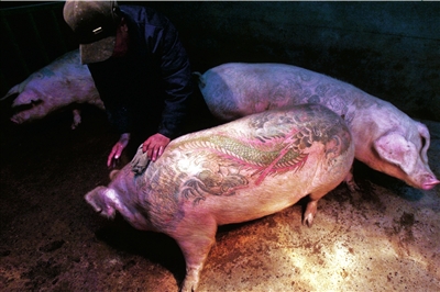 記者看到,還有9頭文身豬在寬敞明亮的豬圈中,而原來一起長大的3個同伴都準(zhǔn)備前往歐洲,并被賣出了70萬到100萬元人民幣的高價(jià)。9頭豬都是母豬,剛滿周歲。“因?yàn)槟肛i更耐痛,文身更方便。”飼養(yǎng)員潘師傅說。見到生人進(jìn)到豬圈,豬開始不安分地嗷嗷叫。這幾頭豬的體重都在400斤以上,長得極為肥碩。它們身上都文有精美的圖案。“這頭文著龍紋標(biāo)志的豬就叫大龍,文著美人魚的就叫美人魚,它們的名字都是根據(jù)花紋取名的。”其他豬身上文著宗教畫、中國年畫和卡通圖。