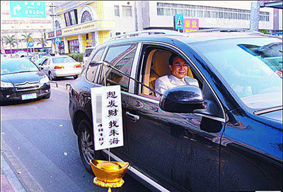 組圖中,一輛黑色保時捷正在行駛,前排一白衣中年男子將一雷人“釣具”伸出車窗外,邊行邊“釣”。“釣竿”是一個高爾夫球桿,“魚餌”是個“金元寶”,“垂釣”口號則是“想發財找朱海”,字旁標有一個手機號碼。據圖說介紹,該場景出現在2月20日的深圳市羅湖區寶安北路深圳市人才市場附近。