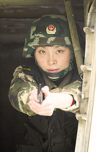 10米外,一個身著特警作戰服的女兵掏槍、舉槍,“叭”的一聲,彈殼無影。