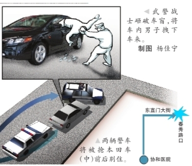 知情人透露,那輛本田車被搶后,該車司機立即撥打110報警,北京警方隨即向附近所有執勤的民警、武警、警車發出圍堵命令,在全城范圍內堵截這輛黑色本田車。上午10點,一輛武警巡邏車和一輛110巡邏車按布控指令行駛到東直門內大街時,發現了正在瘋狂逃竄的本田車,兩輛巡邏車立即鳴響警笛一路追去,并最終將本田車別住,抓獲犯罪嫌疑人。