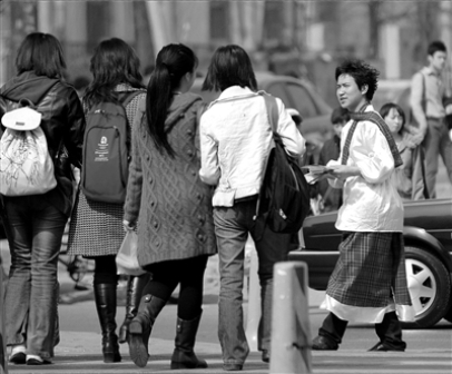 這家比薩店位于北京第二外國語學院北門,扮成“小沈陽”的服務(wù)員在北門十字路口發(fā)傳單,許多學生從他身邊走過時紛紛回頭。“遠看還挺像的”,二外的孫同學說,自己和同學進去試吃了傳單上的“蘇格蘭打鹵面”,感覺和西餐中的意大利面差不多。