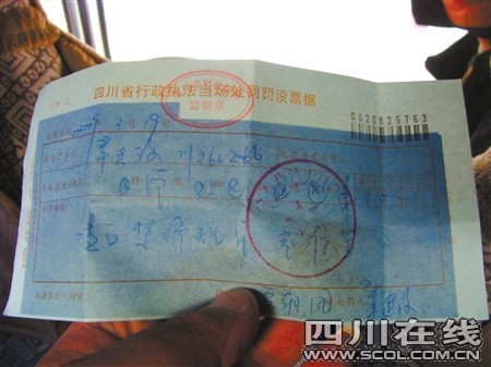 19日上午10時許,仁壽縣城區書院街,倪師傅正騎著新買的三輪車。一輛沒有牌照的長安之星警車,突然停在他面前,從車上下來兩個身著交警協警員制服的男子:“你的車不能進城,過來接受處理。”倪師傅解釋說:“警官,我是來給車上牌照的,交警大隊在城里,我必須進城啊。”“少說這些,違反了規定就要罰款。本來罰200元,念你是初犯,交100元就是了。”隨即,坐在該車駕駛室里的一名身著交警制服的中年男子開了一張100元的罰款單據,倪師傅最終只得無奈地交了罰款。