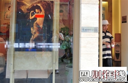 這家攝影店位于春熙路南口,在臨著步行街的一排商鋪中。店門口一扇巨大的落地玻璃櫥窗里,掛著兩幅照片,其中一幅就是侯女士提到的那幅裸照。照片大約有80厘米高、60厘米寬,照片上的長發女子上半身正面全裸,下半身也只有一層薄紗遮蓋。路過的路人中,有不少人的目光都會在這幅照片上停留。