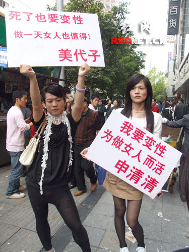 今日(4月13日)下午13時(shí)左右,記者收到網(wǎng)友線索,長(zhǎng)沙黃興路步行街有兩個(gè)怪人舉著“我要變性”的標(biāo)牌,圍觀的市民把路口堵個(gè)水泄不通。記者隨后趕到,發(fā)現(xiàn)其中一人正是前段時(shí)間頻頻曝光的“準(zhǔn)”變性人申清清,另一個(gè)“怪人”則自稱(chēng)“美代子”。