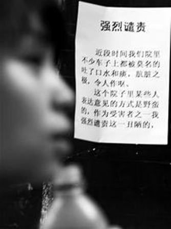 1年多來,家住忠烈祠西街80號的一些車主遭遇了一件怪事:他們停放在小區(qū)的愛車,不時(shí)會發(fā)現(xiàn)被人吐上了口痰。為此,住戶杜先生在小區(qū)門口貼了一份《強(qiáng)烈譴責(zé)》,不料“神秘人士”竟然將口痰包在紙中,放在他的車上……昨(21)日,杜先生無奈地表示,希望對方能停止這樣的行為,有意見面對面協(xié)商解決。