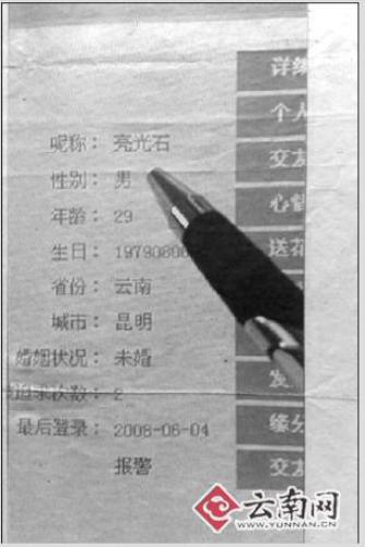 去年3月,網名為“迷惑夢中人”的小麗(化名)閑著無事,便上云南信息港的交友網上玩耍,當看見網名叫“亮光石”的征婚廣告:“29歲,無不良嗜好,采礦業執行官,月收入兩萬元。誠征20至28歲的單身女孩為終身伴侶,學歷高中即可”時,小麗記下了他的聯系方式,雙方還互相留下QQ號碼。