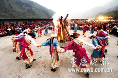 戰勝了地震、恢復了重建,昨天,四川省汶川縣映秀鎮,人們點燃篝火,跳起“鍋莊”,迎接“五一”。