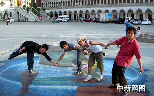 “城市立體畫采用與一般繪畫截然相反的透視技法,參觀者見到的畫面不是平面的,而是具有三維立體的視覺效果。”韓承是這個文化創意的發起人,他告訴記者,這種三維立體效果在照相機的鏡頭里尤為突出,讓人感覺不是拍攝的畫作,而是實景的再現。