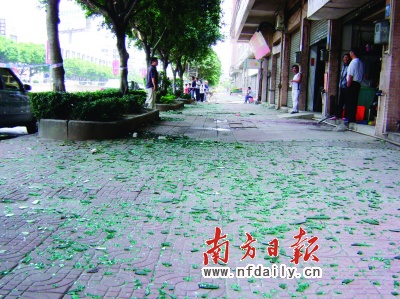 昨日,記者再次來到事發(fā)地看到,警方仍未解除警戒線,幾名民警在現(xiàn)場緊張勘察。事發(fā)街道兩旁的玻璃碎片仍是灑落一地,離爆炸核心位置20多米遠(yuǎn)的一家修理店老板介紹,很多玻璃碎片都是從對面街道飛過來的,他指著一塊插入卷閘門的石頭說:“這個也是從對面飛過來的,當(dāng)時爆炸的威力太可怕了。”