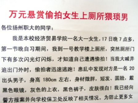 18日,一張張名為《萬元懸賞偷拍女生上廁所的猥瑣男》的“懸賞啟事”,張貼在了揚州職業(yè)大學(xué)校園內(nèi),吸引了該校師生的注意。記者看到,“懸賞啟事”標(biāo)題的字體和顏色都格外醒目,內(nèi)容為一位大一女生遭遇偷拍的經(jīng)歷。“我是本校經(jīng)濟貿(mào)易學(xué)院一名大一女生,17日晚7點多,第一節(jié)晚自習(xí)期間,我到一號教學(xué)樓上廁所,突然廁所門下有多次閃光燈閃爍,才知道自己遭遇偷拍!……我已經(jīng)向警方報案并向?qū)W校保衛(wèi)處反映了相關(guān)情況。為防止更多女生受侵害,早日將這種性變態(tài)的人繩之以法,我個人出10000元懸賞知情人提供有價值線索。”記者注意到,“10000元”的字體很大,而且是紅顏色,格外惹眼。啟事最后還寫著“捍衛(wèi)女生權(quán)益,和偷拍斗爭到底”的字樣。