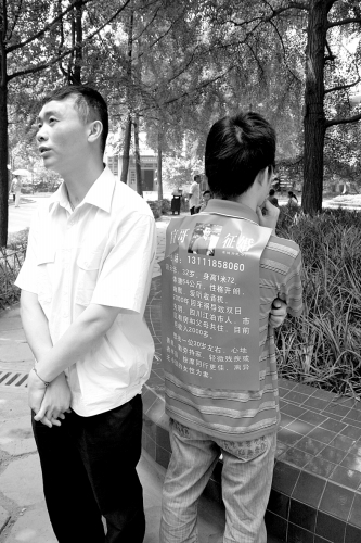 雖然是公開征婚,但王先生和曾天華都顯得很靦腆,不怎么說話。倒是跟在他們身后,戴著墨鏡、背著大牌子的紅衣男子更受人關注。他就是幾天前在街頭出租背部的黃某。曾天華出了100元錢租用他的背部一天,讓其背著廣告牌子,為征婚造勢。