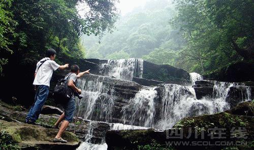 沿著玉屏山頂?shù)穆糜斡^光道前行不久,右側(cè)樹(shù)林邊出現(xiàn)了一個(gè)醒目的標(biāo)識(shí)牌:玉水谷。牌子邊,一條滿是青苔的石板路彎彎曲曲地往山谷深處延伸;步行15分鐘,一條清澈的小溪即映入眼簾,其間綿延的疊瀑群格外迷人,這便是昔日的“磨子溝天體浴場(chǎng)”,現(xiàn)在的“玉水谷”。