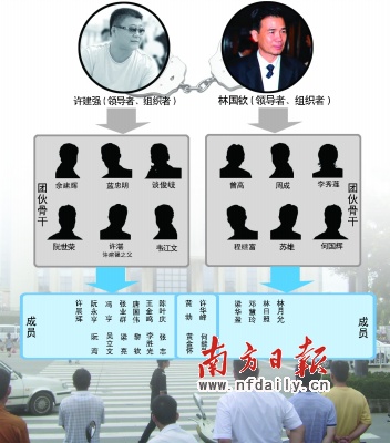 上世紀80年代末,許建強和林國欽從小混混開始,逐漸發展到拉幫結派。根據指控,許建強和林國欽1990年在賭博中結識。當時許建強在社會上混,并因打架出名,在偏行中有一定地位和影響。林國欽為了借助許建強的勢力而與許建強合伙賭博。1992年底阮世光被槍殺后,許建強和林國欽糾集成員通過賭博等違法犯罪活動聚斂財務,經濟實力不斷壯大,逐漸發展成為黑社會性質犯罪組織。