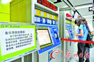 同樣的現(xiàn)象出現(xiàn)在一、三號(hào)線換乘的體育西路站,記者上午10時(shí)左右在體育西路站G出口的大廳位置看到,這里有6臺(tái)售票機(jī),其中就有四臺(tái)顯示為紅色提醒,字幕為“不找零錢”。