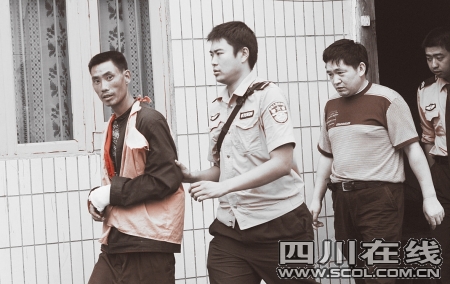 昨日中午12時,劉啟寬穿著彭州市看守所的衣服,戴著手銬,左手包扎著紗布,被警方帶回事發現場。他個子高高的,又瘦又黑,沒有穿鞋,始終低頭不語。就在劉啟寬指認現場的時候,其哥哥劉啟保也回來了。兩兄弟對望一眼后,都匆匆把視線移向別處。