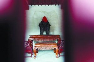 這座尚未完工的四合院風(fēng)格祠堂,朱紅色的圍墻四周,花崗巖雕成的石欄環(huán)繞。院內(nèi)東西廂房?jī)?nèi)分別擺設(shè)著整體浴缸和木質(zhì)仿古雕木床。正房中擺放著一座3米高的銅像。