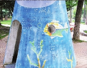 昨日有市民投訴稱,市青少年宮內—處“趣味天地”的兒童游樂場“城堡”,被—些入視為“愛情宣言”之處,刻寫得面目全非。