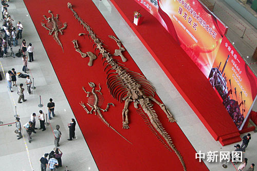 中新網北京8月18日電 (記者 孫自法)三具侏羅紀時期的恐龍化石,十八日下午在它們的“新家”——中國科學技術館新館揭開“紅蓋頭”,正式由云南省楚雄彝族自治州“嫁”入北京落戶中國科技館新館,并將于下月中旬新館開放后進行永久性展出。