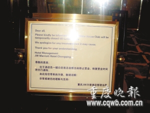 昨日,記者來到位于較場口的萬豪白宮會所。會所大門緊閉,一個告示牌放在門口,上面寫著:“尊敬的貴賓,白宮會所已停止營業,恢復營業時間另行通知。”落款是重慶JW萬豪酒店管理當局。