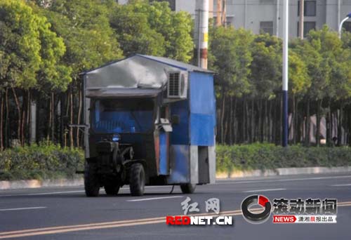 從房車的正面來看,該房的主體就完全顯露出來了,車的前部是一輛舊式手扶拖拉車,輪胎、水箱、傳動(dòng)皮帶一應(yīng)俱全;中部是駕駛室主體,跟街頭常見的殘疾車一樣。主要由駕駛室、前面檔風(fēng)玻璃、觀后鏡,一樣都不少,更讓人稱奇的是這輛房車騎駛室頂端(即觀后鏡上方),裝著一臺(tái)空調(diào)掛機(jī)的主機(jī),顯示這臺(tái)房車即便是在炎熱的夏天,也依然能照常使用。房車后部則是主體部分,鋁合金制的車廂、三角形車頂、兩個(gè)后輪,構(gòu)成一輛移動(dòng)的房車。